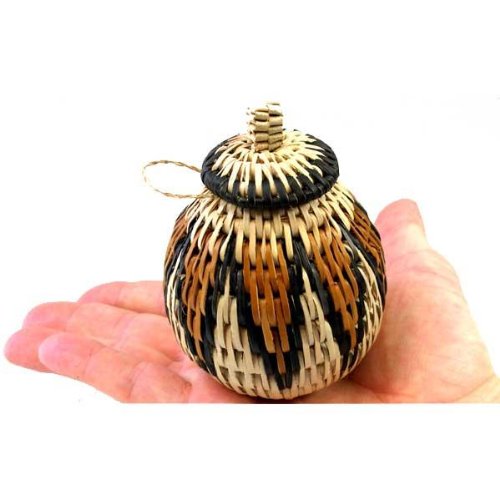 This 3 inch tall "Ukhamba" or beer basket is a bulb-shaped basket with a lid traditionally used to store the local brew. Made in South Africa by Ilala Weavers, these herb baskets are miniture versions and are used to store dry herbs.