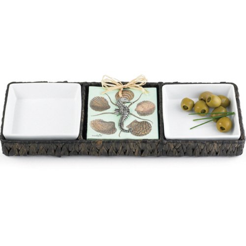 Woven basket with 3 sections includes 2 porcelain inserts, 12 cocktail napkins and a metal seahorse weight.